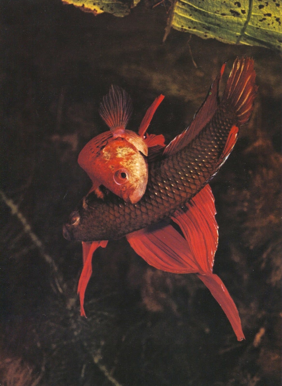 (Image descriptions: two fish, one bright red and the other one of a darker shade, are in a courting ritual, swimming around each other, entangling. Source: Wonderen van de voortplanting in de dierenwereld, Van Stuijvenberg W., Amsterdam Boek)